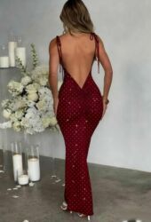Elegantna duga haljina sa sitnim sjajnim tačkicama. Model sa dubokim otvorenim leđima u V kroju i naborom na sredini, koje vizuelno oblikuju figuru. Tanke bretele se vezuju na ramenima za prilagodljivo pristajanje. Prednji deo sa blagim kaskadnim dekolteom. Ravan, uski kroj prati liniju tela do poda.