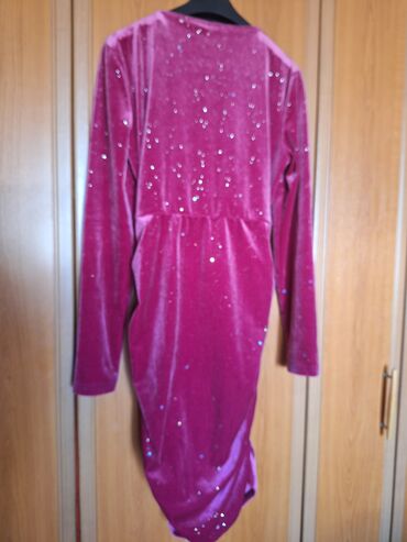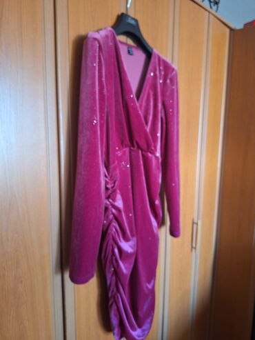 Haljina NOVA od plisa, dug rukav, svecano elegantna, na V izraz, prati liniju tela, sa strane nabrana, ima dosta elastina pa se siri za i br veca, prelepa, ukrasena diskretnim sitnim srebrnim sljokicama za sve prilike! Br. L