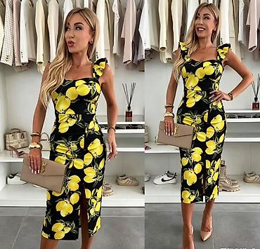 Saten haljina midi dužine sa volan naramenicama i prednjim prorezom. Kroj prati liniju tela, sa oblikovanim korpama i kvadratnim izrezom koji ističe dekolte. Materijal je glatkog, svilenkastog sjaj...