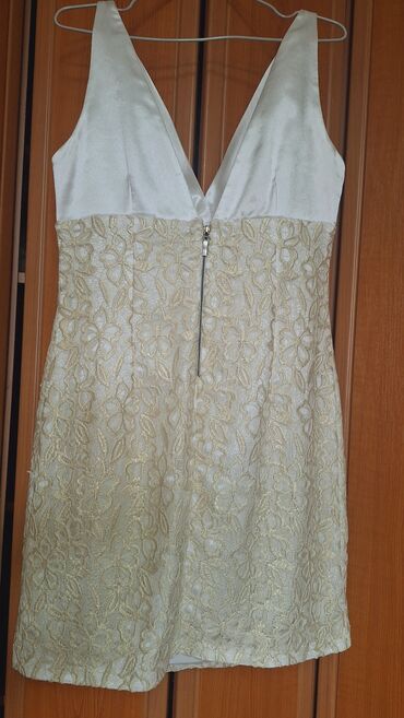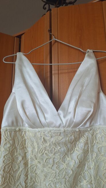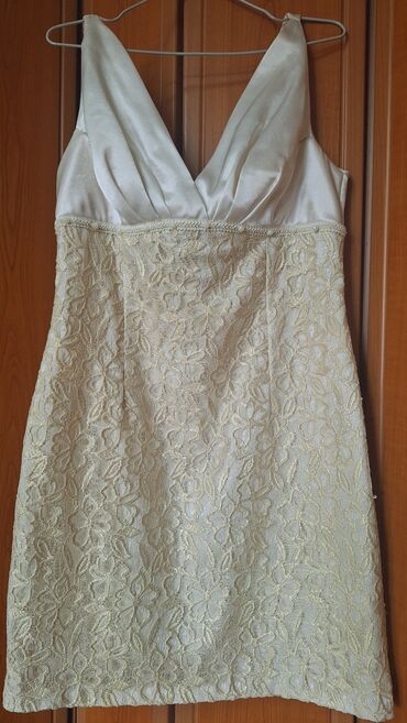 Haljina saten NOVA na V izraz sa zlatkastom cipkom i b8serima duz deholtea, vrlo svecana, elegantna, ravnog kroja, postavljena, na grudima ocvrscivace, br. L(40)/(42)XL! Duzina 90cm, sir grudi 42cm! Skupocena!