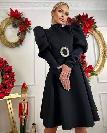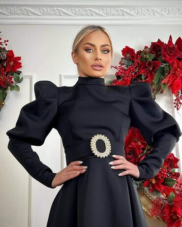Elegantna haljina sa gornjim delom u plavo-crnom dezenu i crnom suknjom. Velicina 48. - Kroj: midi dužina, naglašena struk linijom sa nabráním, blago puf rukavi do zgloba. - Materijal: satenski sja...