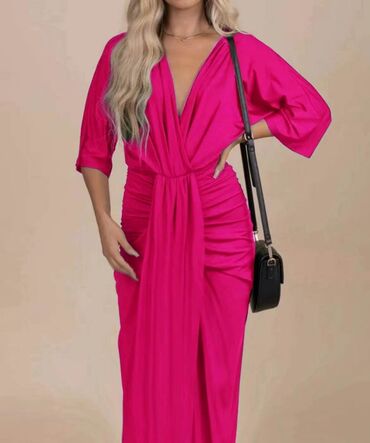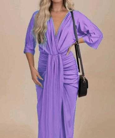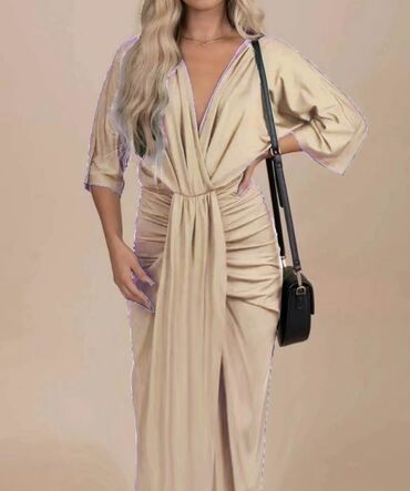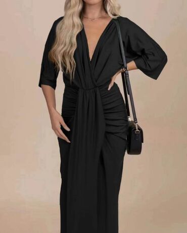 Elegantna večernja haljina – crna, duga, sa dramatičnim šlepom i visokim šlicem. - Kroj: sirena/suknja sa naborima napred, visoki otvor na butini, produženi asimetrični šlep sa strane. - Gornji de...
