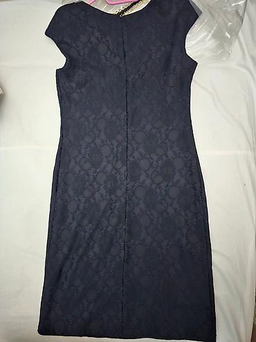 KATRIN haljina, veličina 44, obucena jednom. - Model: midi dužina, dugi rukavi - Boja: tamnoplava/teget - Kragna: izražena Peter Pan kragna sa blagim obrubom - Struk: uvučeni struk sa tankim podes...