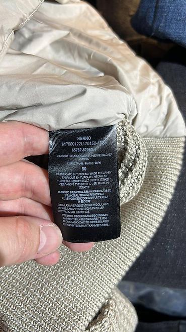 - Detalji: diskretna Herno metalna pločica/etiketa na pletenom delu; kontrastni crni zipovi naglašavaju liniju