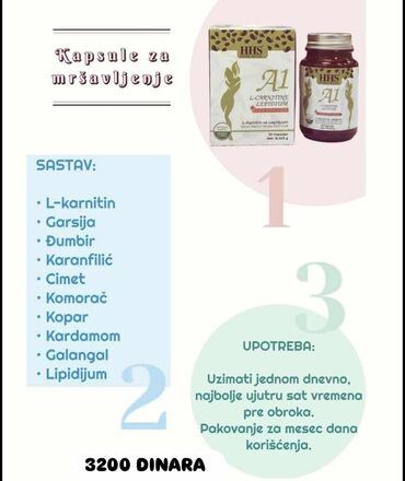 Kapsule za mršavljenje HHS A1 L-Karnitin Lepidijum su dodatak ishrani namenjen podršci u procesu regulacije telesne težine. Sadrže kombinaciju L-karnitina i lipidijuma, uz druge prirodne sastojke poput garsije, đumbira, karanfilića, cimeta, komorača, kopra, kardamoma i galangala. Preporučuje se uzimanje jednom dnevno, najbolje ujutru sat vremena pre obroka. Pakovanje je dovoljno za mesec dana korišćenja. Proizvod je formulisan da pruži podršku metabolizmu i opštem stanju organizma. Karakteristike: Brend: HHS A1 Naziv: L-Karnitin Lepidijum Tip proizvoda: Dodatak ishrani Oblik: Kapsule Sastav: L-karnitin, lipidijum, garsija, đumbir, karanfilić, cimet, komorač, kopar, kardamom, galangal Broj kapsula: 30 Preporučena doza: 1 kapsula dnevno Vreme uzimanja: Ujutru, pre obroka Trajanje pakovanja: 30 dana Namena: Podrška mršavljenju Način pakovanja: Kutija i teglica Primena: Oralna Sertifikati: ISO 9001 Proizvođač: HHS Zemlja porekla: Turska Tip supstance: Prirodni ekstrakti