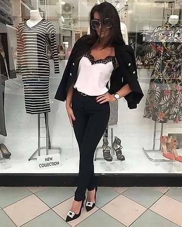 Elegantno ženski komplet – sako i pantalone u crnoj boji sa sitnim cirkonima. Univerzalan za S,M,L - Sako: klasičan kroj bez kopčanja, reveri, dva spoljna džepa. Lagano opuštena silueta, idealan z...