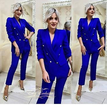 Elegantni ženski komplet – blejzer i pantalonе u boji bordo. - Model: dvodelni set u istom tonu - Blejzer: dvoredno kopčanje sa dekorativnim zlatnim dugmadima, rever kragna, dve lažne preklop džep...