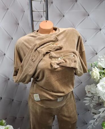 Damski komplet – bluza i pantalone - Model: elegantan dvodelni set od mekog, rastegljivog pletiva. - Gornji deo: V-izrez, dugi rukavi, asimetrično preklapanje sa dekorativnom okruglom kopčom kod s...