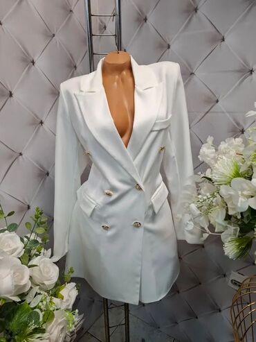 Ženski sako-haljina sa pojasom - Model: dvoredni kroj, istaknuta struk-linija sa odvojivim pojasom za vezivanje - Materijal: glatka tkanina sa diskretnim sitnim tačkicama (svilenkast sjaj) - Kragn...