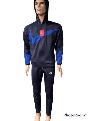 Muški komplet trenerki – dva modela 1) Nike komplet: - Gornji deo na rajsferšlus, visoka kragna - Boje: crna sa plavim ramenima i belim detaljima/linijama - Diskretni Nike Swoosh logotipi na jakni...