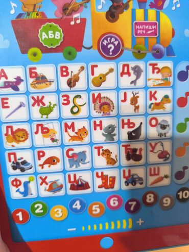 - Tasteri sa slovima srpske azbuke (А–Ш) ilustrovani odgovarajućim sličicama za lakše učenje.