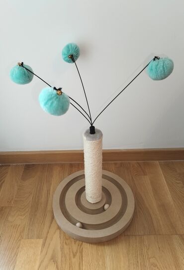 - Višenamenski dizajn: centralni stub obmotan sisal kanapom za grebanje i istezanje, sa gornjim „granama” od fleksibilnih žica i četiri plišane tirkizne loptice sa zvončićima za podsticanje igre.