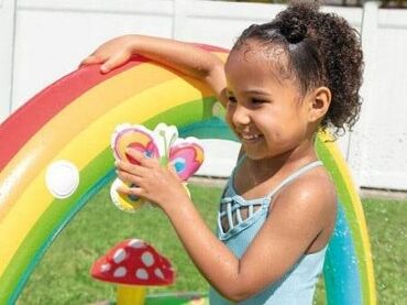 Bazen ima ugrađenu prskalicu - samo spojite baštensko crevo i voda će početi da prska iz duge.