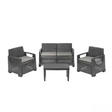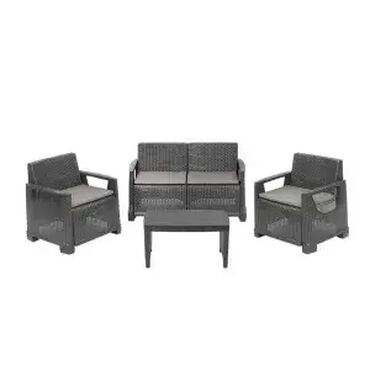 – Idealan za terasu, dvorište, a takođe dobar i za unutrašnje korišćenje. – Napravljen od kvalitetnih materijala otpornih na habanje, lagan za prenošenje, vodootporan, lak za održavanje. – Četvorodelni plastični set, dve stolice, sofa, sto, ratan stil, sa četiri jastuka, udoban, prijatan za sedenje, ergonomski naslon. – 100% napravljen od recikliranih materijala.