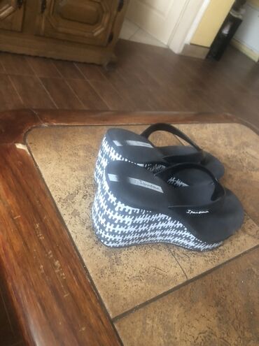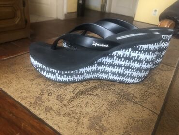 Ženske Ipanema papuče sa platformom u crnoj boji, idealne za letnje dane. Model ima karakterističan kaiš između prstiju i visoku platformu sa crno-belim geometrijskim dezenom. Pogodne su za opušteno nošenje, plažu ili šetnju. Izrađene su od izdržljivog materijala, pružajući udobnost i stil.