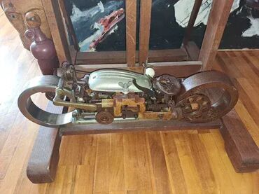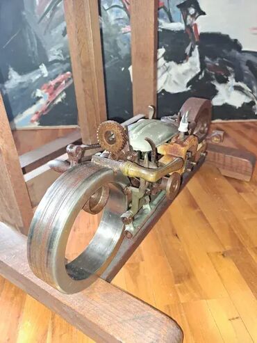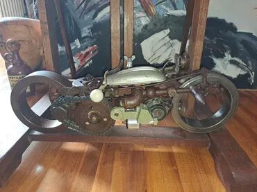 MetalIzuzetno zamisljena i izvedena zamisao od starih komada gvozdja i ostalih metala u formu motorcikla Od ideje i vestine nastala je skulptura koja moze da ukrasi svaki prostor, od privatnog do javnog. Jako masivna, samostojeca instalacij, dugacka 60cm.