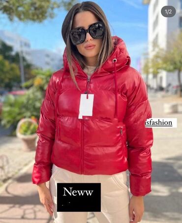 Ženska kratka jakna – biker stil - Boja: intenzivno crvena - Kroj: strukirani, kratki model do kukova, rever sa drukerima, epolete na ramenima - Zakopčavanje: kosa prednja rajsferšlus zatvarača u ...