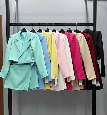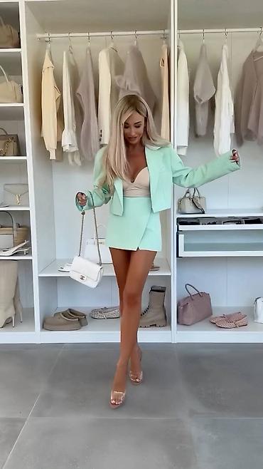 - Dvodelni set: strukturirani crop sako sa reverima + asimetrična mini suknja visokog struka