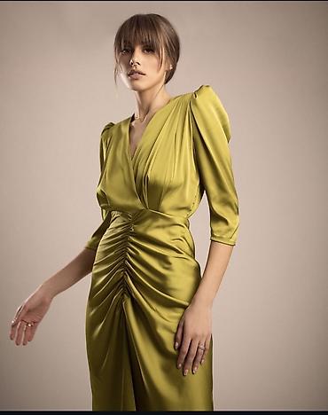 Elegantna midi haljina (odgovara veličini S/M) jednom nošena. - Materijal: glatka satenska tkanina sa suptilnim sjajem i finim šljokičastim odsjajem. - Kroj: ženstvena silueta sa strukom naglašeni...