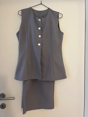 Ženski set: kratki sako i šorts - Sako: moderan, kroj do struka, V-izrez bez klasičnih revera, dugi rukavi. Ukrasni zlatni dugmići sprijeda (po dva sa svake strane) i imitacije džepova. Postavljen...