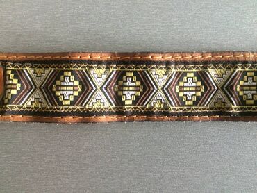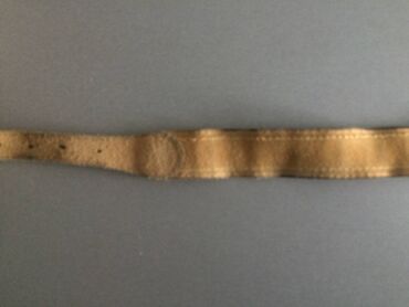 Ženski kožni kaiš u bež/karamel nijansi sa upadljivom masivnom zlatnom kopčom u obliku slova „M”. - Materijal: glatka sintetička/eko koža (na pogled) sa sjajnom metalnom kopčom - Boja kaiša: topla...