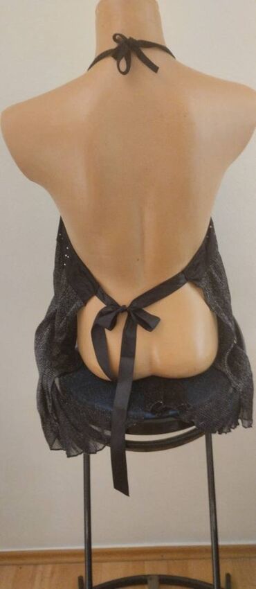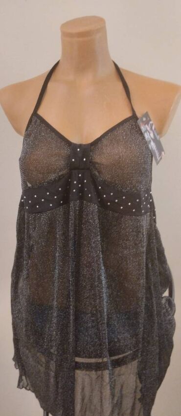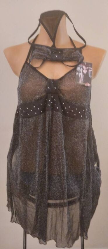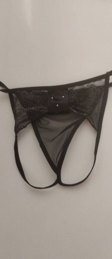Crni sexy veš sa etiketom. Ima štras i šljokice. Providan. Univerzalne veličine. Sastav 80 posto poliamid i 20 posto elastin.