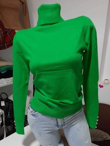 Zeleni ženski džemper sa širokom rol-kragnom. - Dužina rukava: dugi rukavi - Kroj: strukiran, sa izraženim rebrastim porubom u donjem delu za lepšu siluetu - Dezajn: jednobojan, tamnozelena ni...