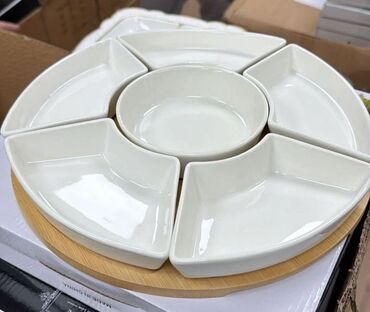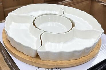 O trošku kupcaKeramički set sa drvenim postoljem✅ Sastoji se od više odvojenih keramičkih činija postavljenih na okruglo drveno postolje, idealno za posluživanje različitih predjela, umaka ili grickalica. ,💎