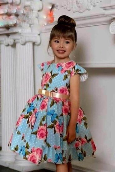 Dečija haljina svetloplave boje sa belim cvetnim vezom oko izreza. Model je A-kroja sa naboranom suknjom i 3/4 rukavima sa blago karnerisanim završetkom. Okrugli izrez, kopčanje na dugme pozadi (ka...
