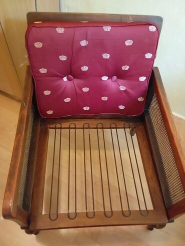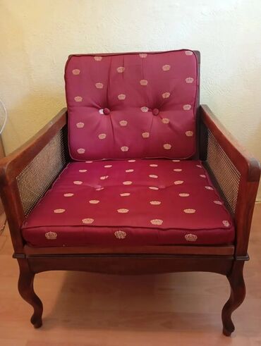 - Tapacirung: dve odvojene jastučiće – sedište i naslon – u bordo štofu sa diskretnim zlatnim motivima (krunice). Jastučići su dugmadima proštepani radi boljeg držanja punjenja.
