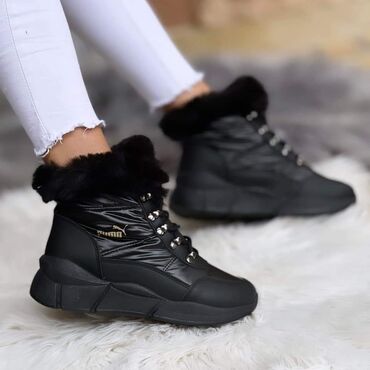 Crne ženske zimske čizme sa niskom saraom i dekorativnom pletenom trakom u beloj/crnoj šari oko risa. Gornjište od mekog materijala nalik brušenoj koži, topla postava iznutra. Deblji, zupčasti đon ...