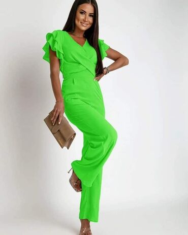 Ženski kombinezon – maslinasto zelene boje - Model: dugi kombinezon sa kratkim rukavima i kragnom - Gornji deo: košulja na dugmad, dva dekorativna grudna džepa sa preklopom - Donji deo: široke nog...