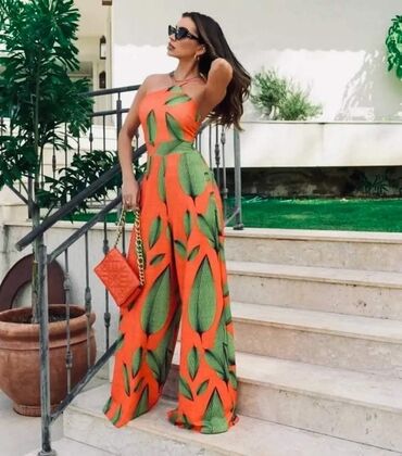 Elegantan ženski kombinezon bez rukava sa širokim nogavicama i V-izrezom. Dizajniran sa širokom kragnom i velikim, ukrasnim dugmadima zlatne boje, koja dodaju sofisticiranu notu. Kombinezon ima pra...