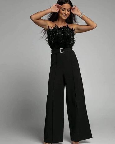 Elegantni ženski kombinezon bez bretela u CRNOJ boji - Gornji deo: srcoliki izrez, nežno drapiran korpus koji oblikuje poprsje; uski struk koji naglašava siluetu. - Donji deo: široke nogavice sa...
