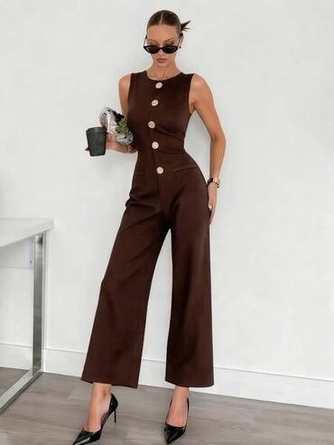 Elegantan ženski kombinezon bez rukava sa širokim nogavicama i V-izrezom. Dizajniran sa širokom kragnom i velikim, ukrasnim dugmadima zlatne boje, koja dodaju sofisticiranu notu. Kombinezon ima pra...