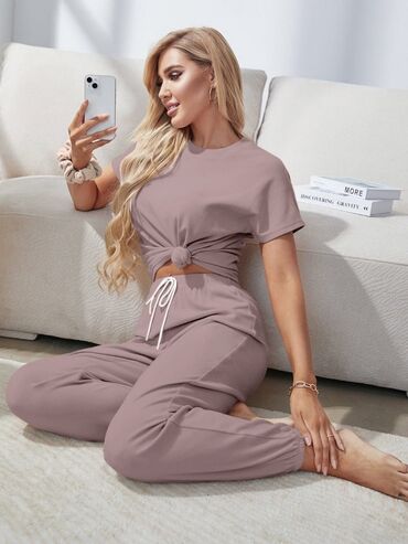 Dvoslojni ženski komplet – rebrasti lounge set - Dvodijelni komplet: kratki top dugih rukava + pantalone sa širokim nogavicama - Rebrasta (riblja kost) tekstura sa rastegljivim vlaknom za udobno p...