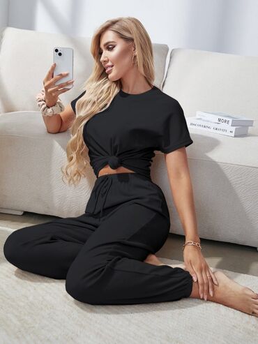 Damski komplet – rebrasti pleteni duks i suknja, crna boja. - Materijal: elastičan, rebrasti plet (prijanja uz telo, udoban za celodnevno nošenje) - Gornji deo: duži duks/bluza sa okruglim izrezom...