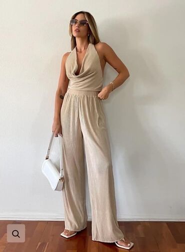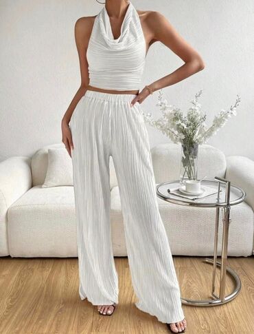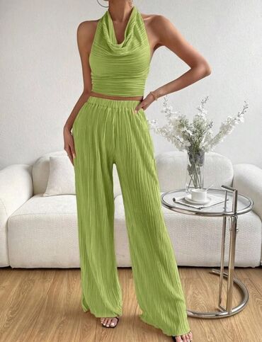 Damski komplet – bluza i suknja, tirkizno/plava boja. - Bluza sa kratkim rukavima, V-izrezom i kopčanjem na prednjoj strani sa pet dugmića. Ravnog, komotnog kroja sa bočnim prorezima za lakše kret...