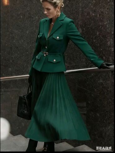 Ženski komplet – elegantno odelo sa sako‑m i pantalonama veličine S, M, L - Kroj: strukirani sako sa duplim kopčanjem (double-breasted), ukrasni metalni/pera lanci dugmići, rever sa V-izrezom; usk...
