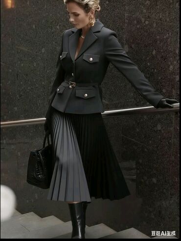 Ženski komplet – sako i široke pantalone Gs - Kroj: moderan oversized fit, široke nogavice sa naborima; sako dužeg kroja, dvoredno kopčanje sa šest dugmadi. - Detalji sakoa: rever oštrog kroja, dva...