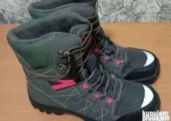 - Planinarske/trekking čizme: visoki model sa ojačanim prstom i petom, tamnosiva boja sa rozim detaljima, kukice za brzo pertlanje, duboki gumeni đon sa naglašenim kramponima za dobro prianjanje, mekana postava oko zgloba za dodatnu udobnost.