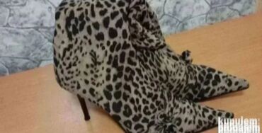 - Ženske salonke/čizmice sa štiklom: špicast vrh, tanka potpetica, materijal sa leopard (animal) printom, meko naboren gornji deo do iznad članka, dekorativne mašnice sa strane.