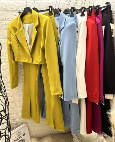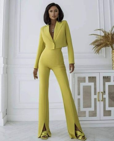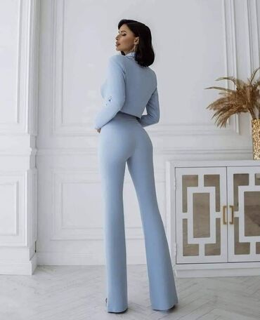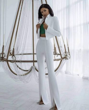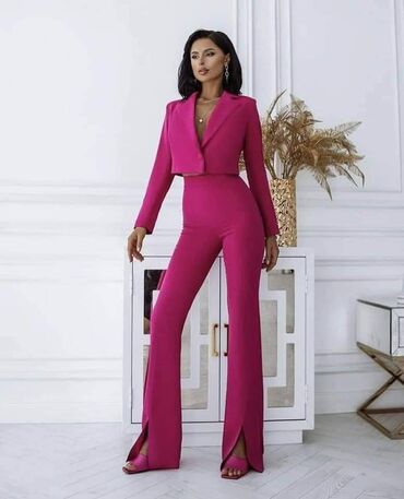 Ženski elegantni komplet – sako i pantalone - Model: dvoredni sako sa zlatnim dekorativnim dugmadima i usklađene ravne pantalone - Kroj: strukirani sako sa reverima, dugmad u dve kolone; džepovi s...