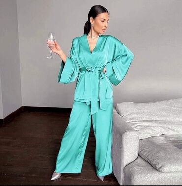 Elegantna ženska kombinacija: svetloplavi bodi i tamnoplave pantalone sa visokim strukom. Bodi: - Boja: svetloplava - Materijal izgled: lagan, lepršav gornji deo sa dugim, blago balon rukavima i e...