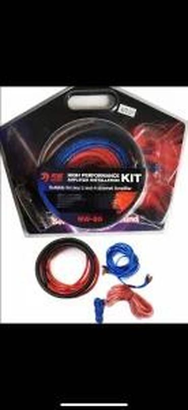 - U kompletu: napojni kabl (crveni) sa zaštitnom spiralom, masa kabl (crni), RCA interkonekt (plavi), remote žica (tanka plava), zvučnički kabl (prozirno/crveni), osigurač i držač osigurača, stopice/priključci i vezice