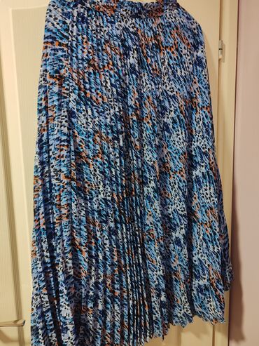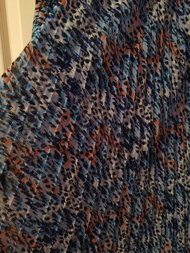 - Suknja: midi dužina, lagani lepršavi materijal sa sitnim plise naborima. Apstraktni/animal print u nijansama plave, crne, bele i narandžaste. Elastičan pojas za udobno pristajanje, kroj sa puno pokreta.