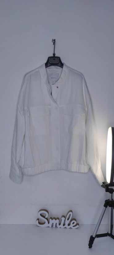 - Bela lagana jakna/košulja-jakna: bezkragna (okrugao izrez), skriveno kopčanje napred, dva velika našivena džepa na grudima, elastičan završetak na rubu za ležeran, moderan izgled; dugi rukavi sa manžetnama.