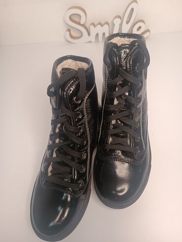 - Lakovane crne gležnjače sa pertlama: sjajan finiš, gumeni đon sa blagim gripom, klasično pertlanje sa metalnim ringlicama, zaobljena kapica. Unutrašnjost obložena mekanim, toplotnim pletivom za udobnost.