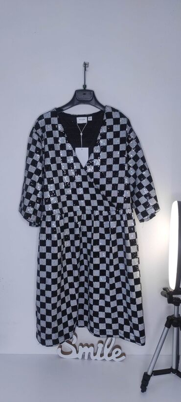 - Haljina VILA: crno-beli karo (šah) dezen sa diskretnim sjajem, preklopni V-izrez, kratki/tričetvrt rukavi, struk lagano naglašen, suknja blago A-kroja do kolena.