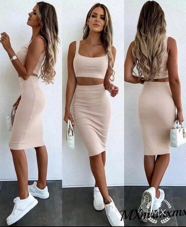 Damski komplet – sako i haljina u bež-krem pepita (sitna kockica) dezenu. - Sako: klasičan kroj sa reverom, kopčanje na 4 dugmeta u boji tkanine, dva ukrasna džepa sa paspulom, blago strukiran, po...